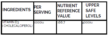 Vitamin D3 supports the development and maintenance of bones, teeth, skin, hair, nails and a healthy immune, brain and nervous system.